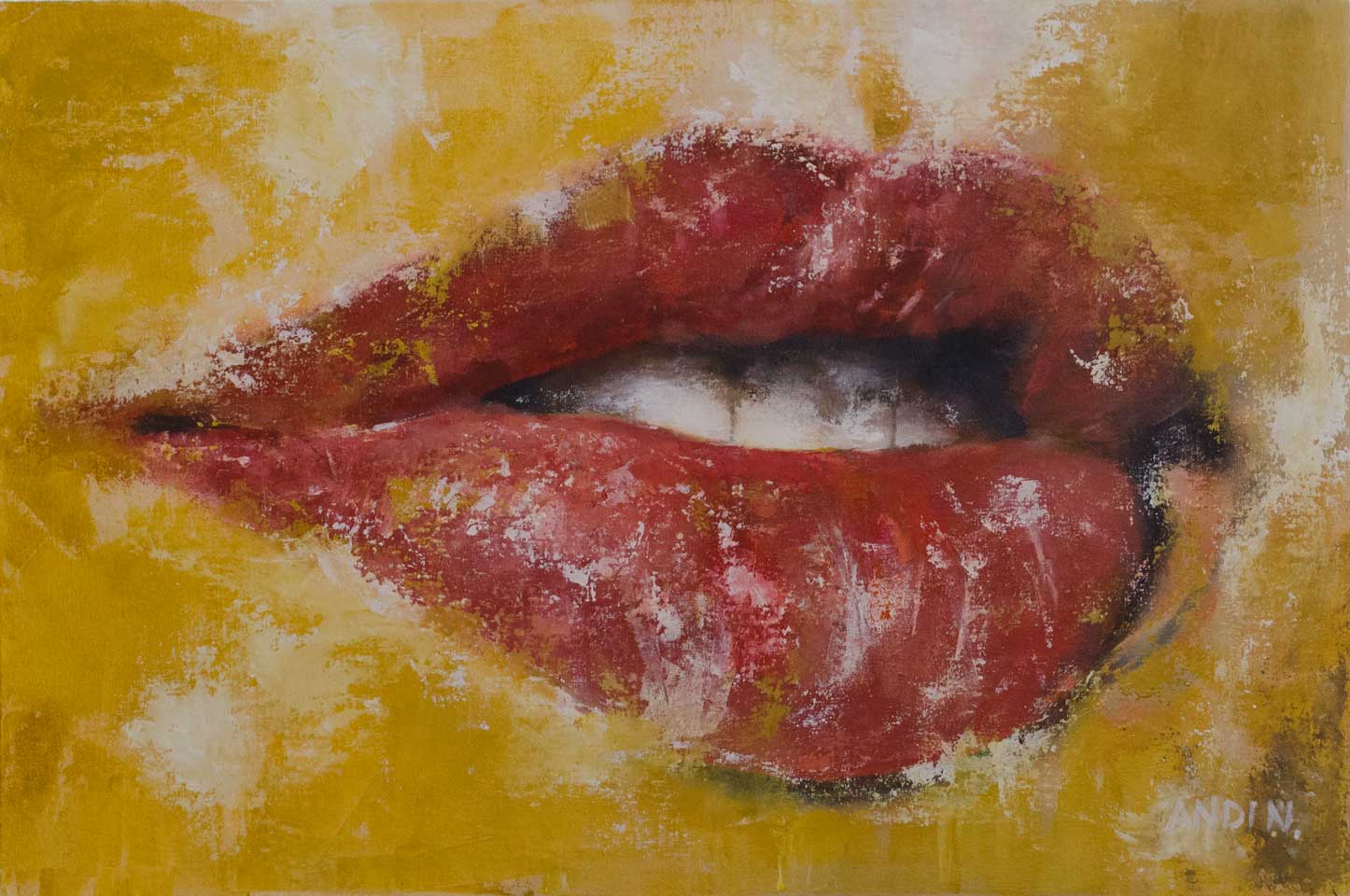 The rich red tones of the lips contrast dramatically with the warm yellow background, creating a vibrant and dynamic composition. The textured brushstrokes add depth and tactility, emphasizing the material quality of oil paint and enhancing the emotional intensity of the image.